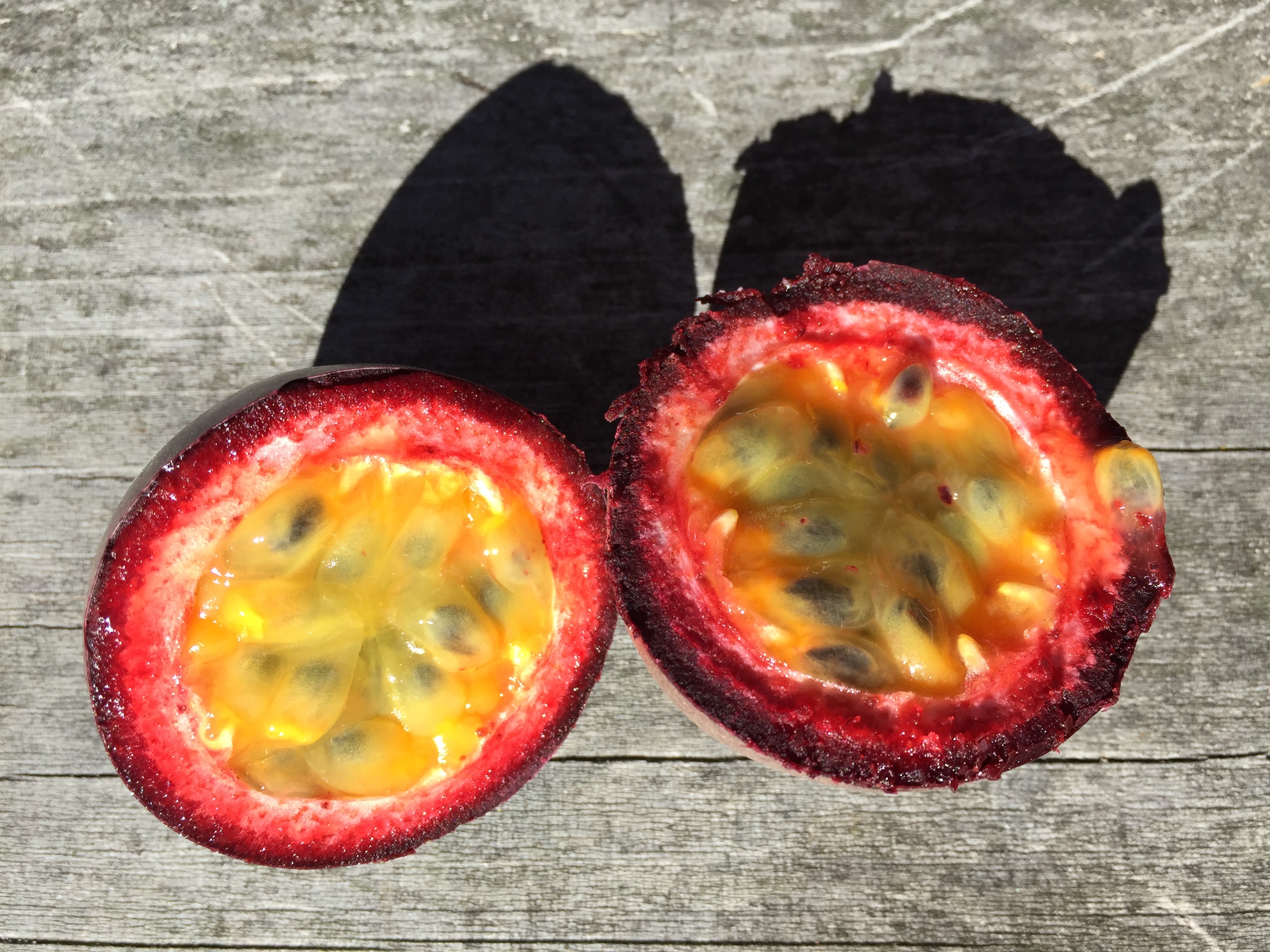 Passionfruit are in season and are one of my favourite fruits. I like scooping them out in their pure state and smelling the shells. I gravitate towards drinks and products with this distinct flavour. For a treat I put a dollop of passionfruit syrup on unsweetened yogurt. Passionfruit are native to the Amazon region in Brazil. They are highly nutritious containing vitamin C, E, iron, magnesium and fibre. I know they are almost a weed up north but down south we pay $30 a kg in season for these purple eggs! ‘Keeping it real’ in the garden, I have to admit the passionfruit at the top was grown by me but was fifty percent of the crop that year. Everyone was present for a great ceremony involved in the fruit gathering and eating. Luckily there are only four of us in the family. We get ‘fruit-tense’ here over small crops.