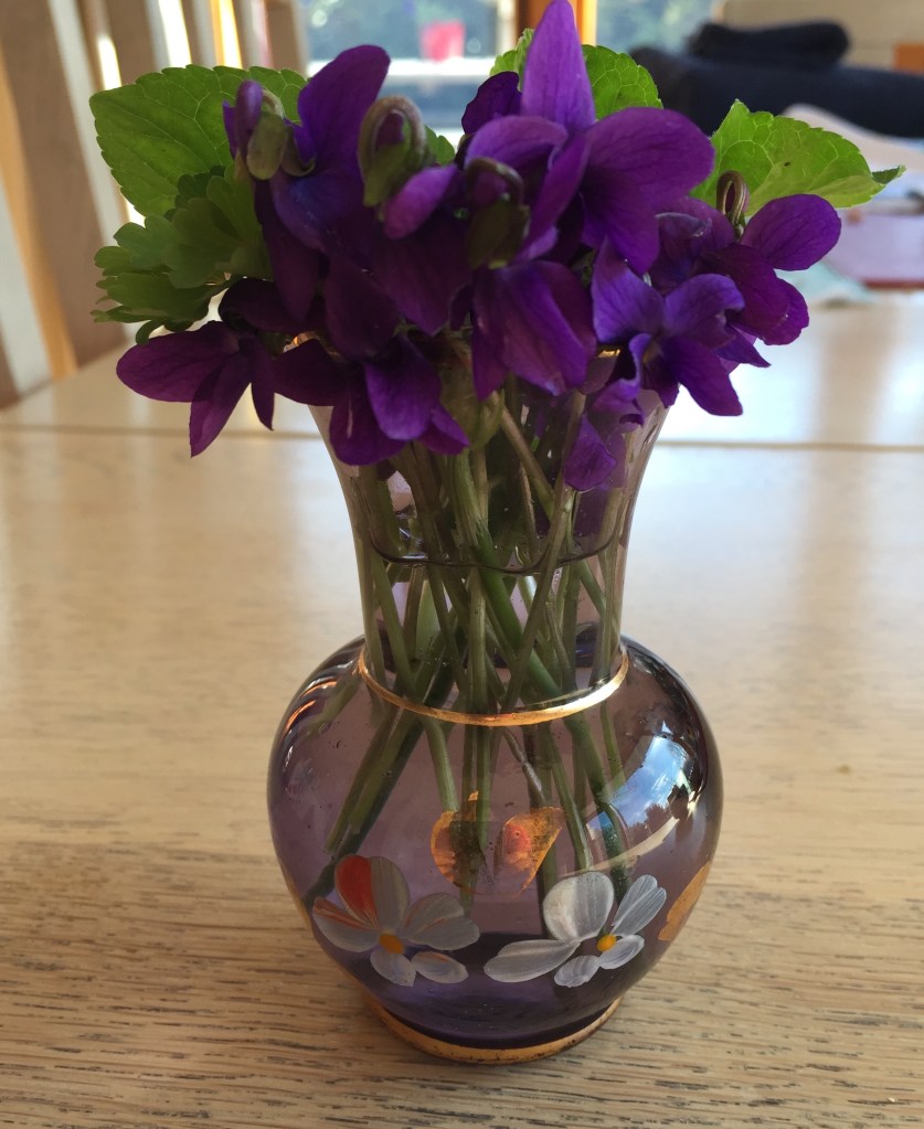 On another note, it was lovely receiving feedback on my last post about appreciating small flowers. Thank you to those who got in touch. I thought you might like this small bunch of violets from my neigbour. I have violets that are out now, but had never thought of picking them.