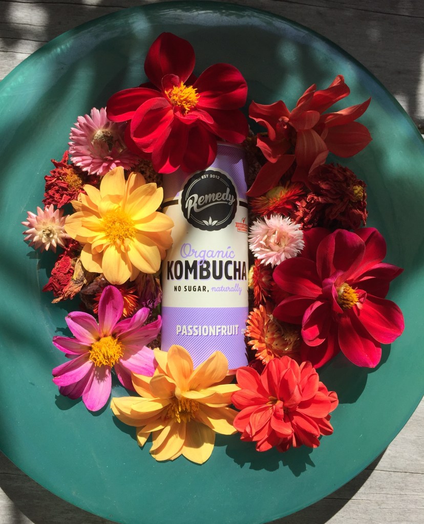 Someone should be paying me for this advertisement! This is my favourite kombucha surrounded by the last of summer dahlias and strawflowers. I’ve got into a recent habit of having a ‘cold one’ while making dinner. It’s very sweet tasting but without the sugar.